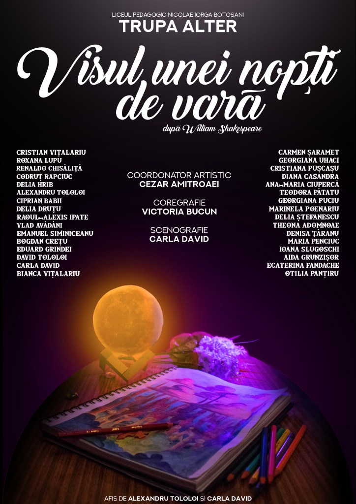 Începem anul cu spectacolul prietenilor de la Trupa de teatru ALTER (Liceul Pedagogic „N. Iorga” Botoșani) – VISUL UNEI NOPȚI DE VARĂ după William Shakespeare, în care își face apariția spiridușul Puck, un încurcă-lume pus mereu pe șotii. Te așteptăm, așadar, JOI, 30 ianuarie la ora 1700, să te bucuri de un spectacol plin de culoare, fantezie și dragoste, care te va face să visezi de parcă ar fi o noapte de vară, chiar acum în mijlocul iernii.