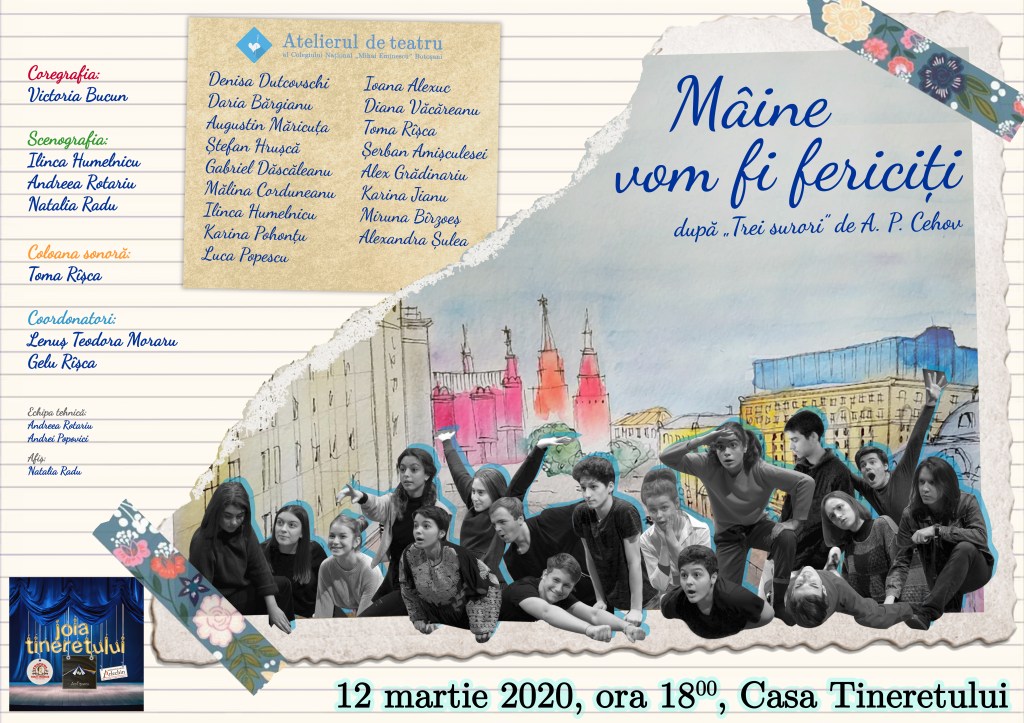 Joi, 12 martie, ora 18.00, primăvara vine la Joia tineretului cu un timp al fericirii pus în scenă de Atelierul de teatru, adaptare a piesei „Trei surori” de Anton Pavlovici Cehov.