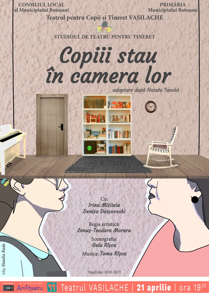 «Inocența, bunăvoința și generozitatea copiilor pot cădea pradă ușor adulților care se iubesc pe ei înșiși uneori mai mult decât pe proprii copii. Inocența, bunăvoința și generozitatea copiilor devin uneori arme într-un război absurd al părinților. Copiii trebuie să rămână cuminți ca să nu deranjeze infatuarea și minciuna adulților. Profesorii sunt niște super-eroi. Puterea lor nevăzută nu este citirea gândurilor sau mutarea munților ci abilitatea de a citi semne ale vieții ascunse ale copiilor. Sunt mai puternici și decât părinții dacă aceștia se copilăresc inutil și se joacă cu viața copiilor lor. Pe lângă informații, profesorii buni mai predau ceva inestimabil dar uneori foarte ușor de neglijat: prețuirea curată și sinceră a vieții. Ai întâlnit un astfel de profesor? Sigur că da, dar e foarte posibil să nu fi băgat de seamă pentru că atenția sa este atât de discretă, încât te vindecă fără să simți (o altă super-putere). Cu un astfel de profesor se întâlnește Miruna la o lecție de engleză. Ce va învăța în afară de verbe și cuvinte, rămâne să descoperi la spectacolul „Copiii stau în camera lor”
